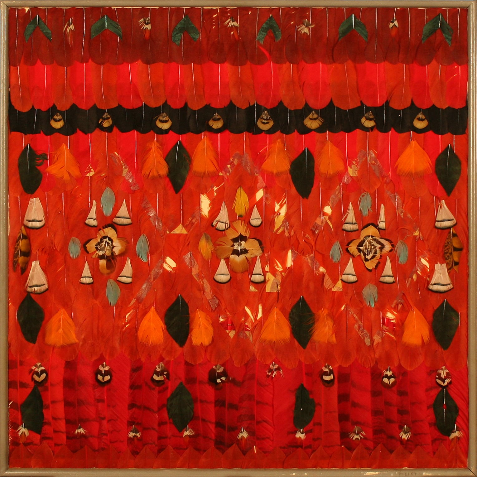 Ses collages de plumes séduisent par le chatoyant de la texture qui apporte une nouvelle dimension à l'harmonie des couleurs.