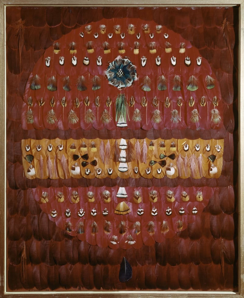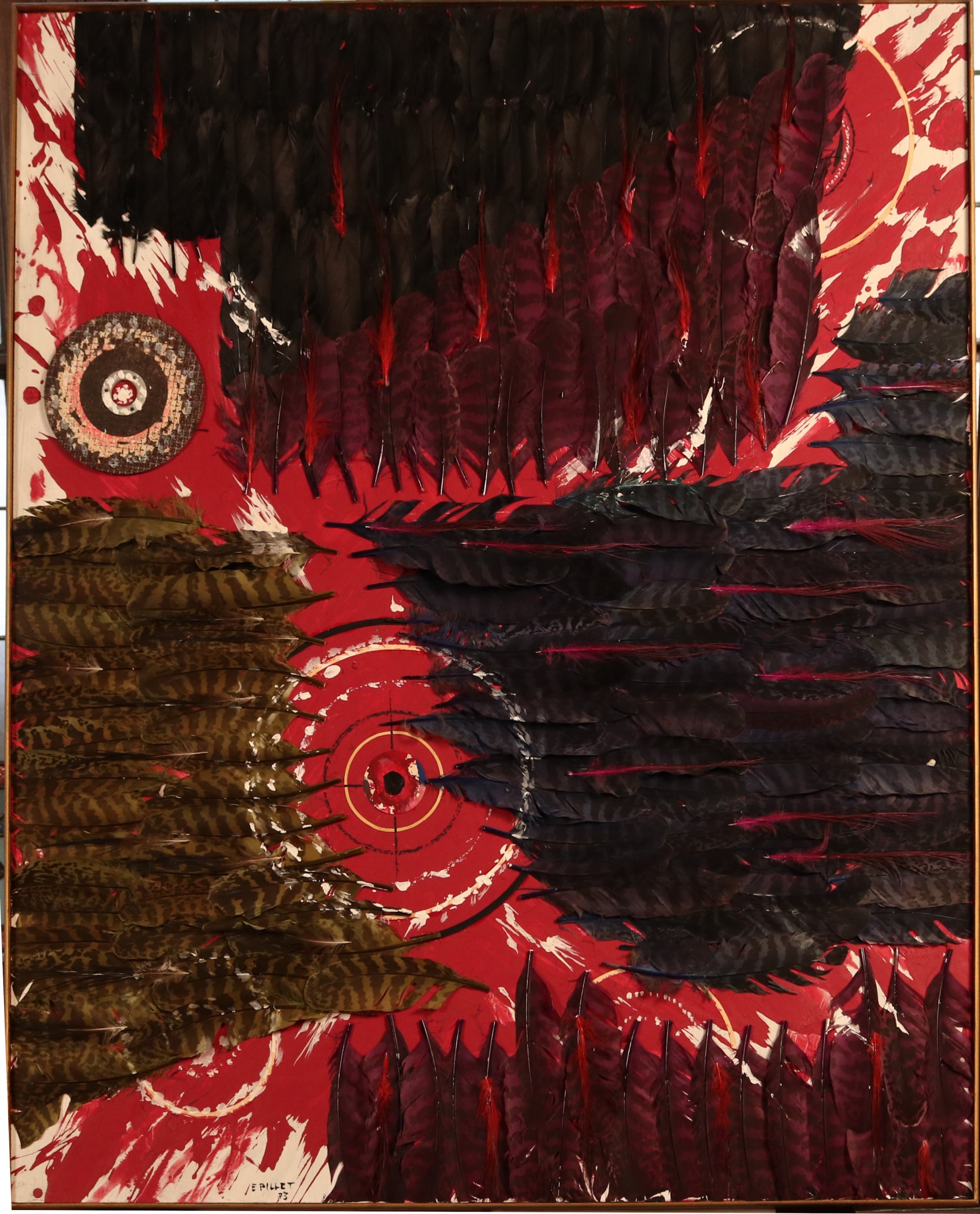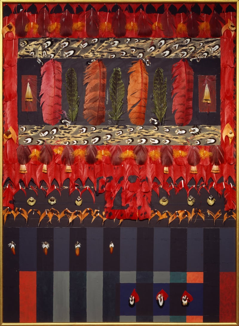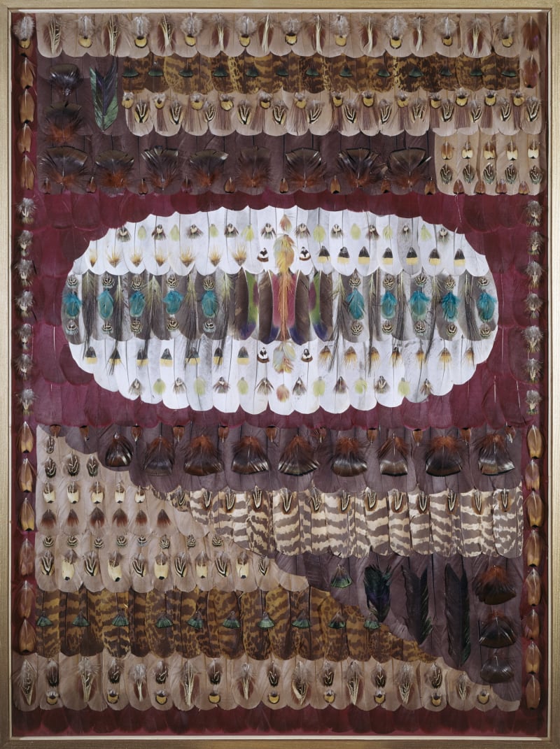 Ses collages de plumes séduisent par le chatoyant de la texture qui apporte une nouvelle dimension à l'harmonie des couleurs.